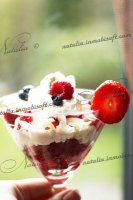 Кладем пару ложек взбитых сливок и опять слой ягод. Сверху шапочка из сливок и миндальные лепестки. Приятного аппетита!