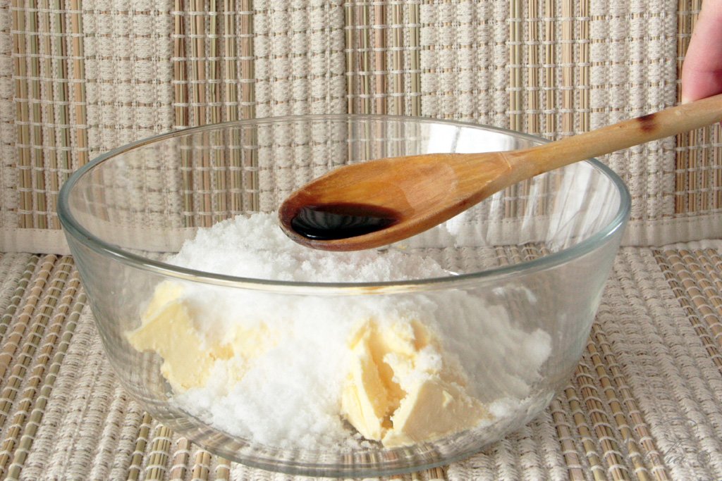 | Сливочное масло комнатной температуры растираем с сахаром, ванилью и солью. Я делала это ложкой деревянной. | |
