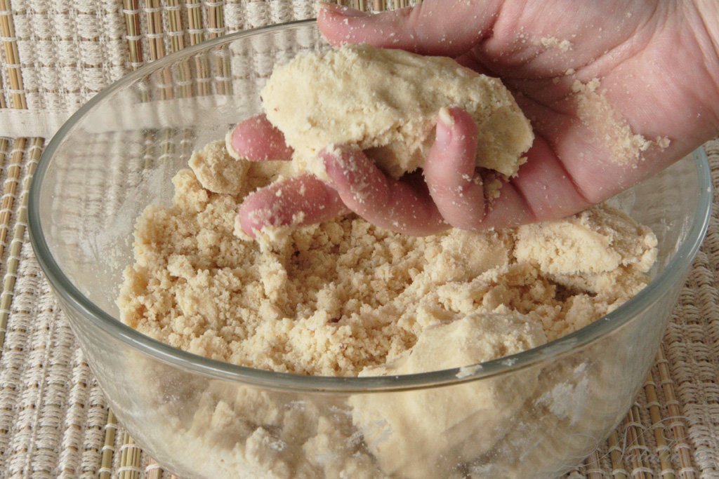 не знаю почему плохо лепились… может я муки больше насыпала или масла меньше.. кто знает.. я не взвешиваю, стаканами мерю… так что думаю — из-за этого дело не шло… у меня не очень крупинки между собой соединялись… потом уже приноровилась, что брала тесто не только на один шарик и пыталась его лепить, а на много побольше, сжимала всей ладошкой, а потом получившее обтесывала — убирала лишнее :)