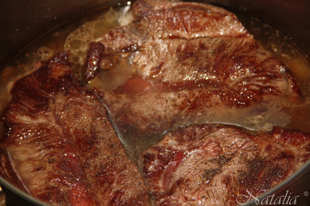 Укладываем наши цукатные куски на луковую подушку. И заливаем горячей водой чтоб слегка прикрыть мясо. Добавляем соль и перец. Накрываем крышкой. Уменьшаем огонь и на полтора часа забываем. |