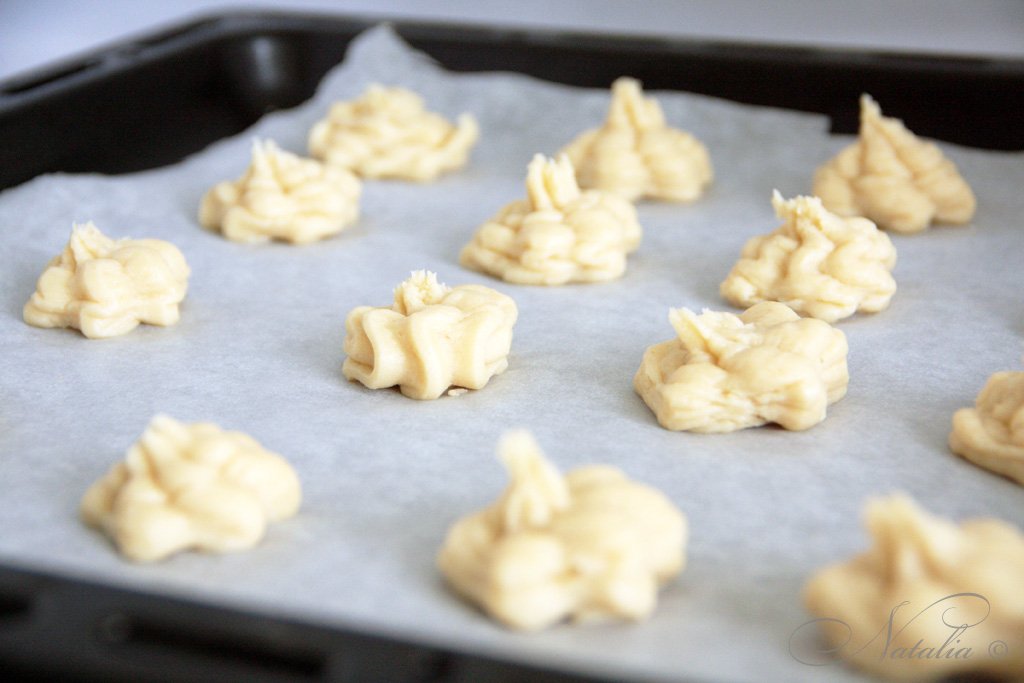 | Не торопитесь добавлять всю муку! Тесто должно быть как густая сметана. Еще важно долго не мешать, а то затянете тесто. Будет трудно его отсадить на лист. | |