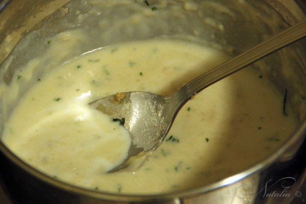 | Теперь очередь добавлять молоко. Тонкой струйкой или частями добавляем молоко и постоянно помешиваем чтоб избавиться от комочков. Соус начнет густеть. Добавляем соль и мускатный орех. | |