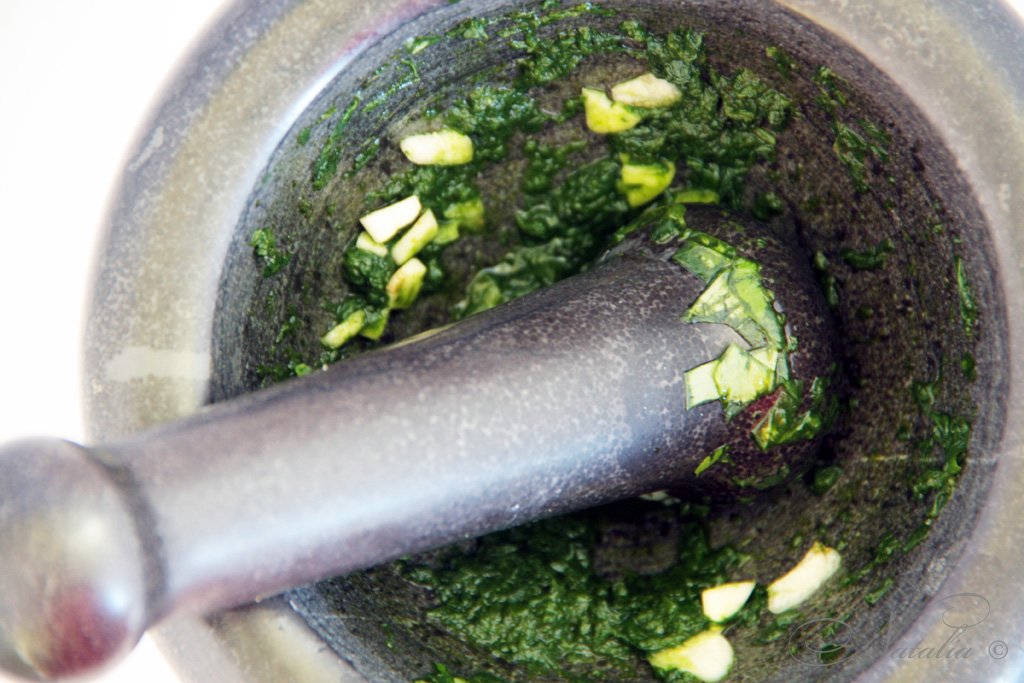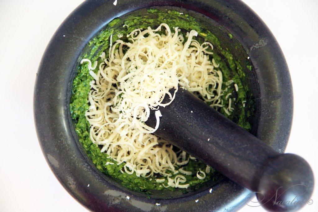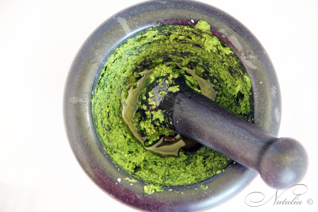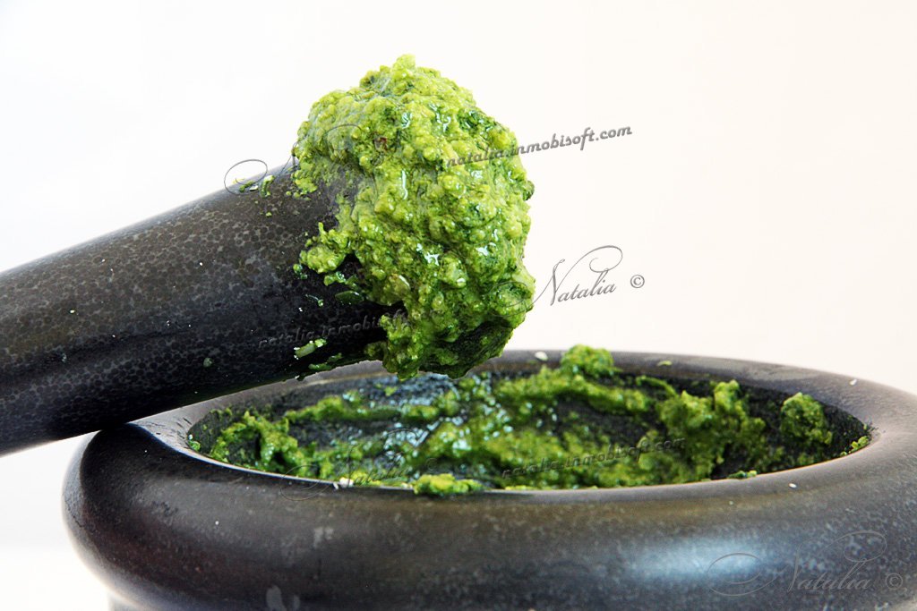 Если вы бывали в Италии, то непременно вам предлагали блюдо с этим соусом! Вариантов песто так же много как и регионов. Но считается, что песто родилось в Лигурии. Это совершенно потрясающее место. Но даже лигурийцы не могут выбрать главный рецепт песто. Как часто бывает люди поделились на два лагеря Западный и Восточный. Западная группировка: Генуя, Савона, Империя, Сан Ремо и Вентимилья. Где считают, что в песто не надо жалеть чеснока и кедровых орешков. Восточная группировка во главе которой Специя предпочитают более нежный соус песто. Но так как в Лигурии я бывала лишь в Генуе, Сан Ремо и Арма ди таджа :) то естественно я примкнула к Западной группировке. А вот вам стоит определиться!