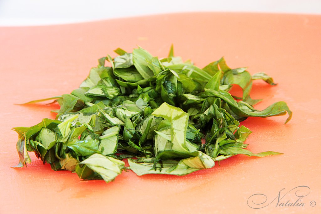 | Нарезаем мелко вымытые листья базилика. Если у вас его вдруг недостаточно, то можно добавить петрушки. Как вариант :) | |