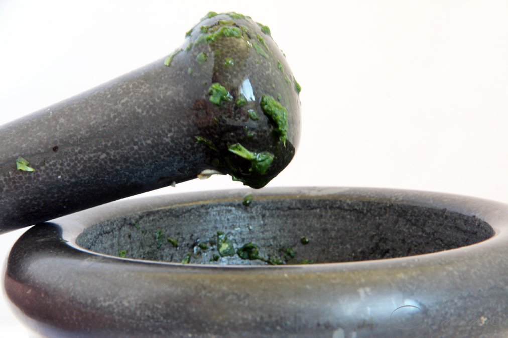 | Берем ступку и растираем листья базилика с щепоткой крупной морской соли. Базилик выделит потрясающе красивый и ароматный сок. Им можно подкрасить какое-нибудь блюдо. Если лень возиться со ступкой, то измельчить можно блендером. Но это менее душевно. | |
