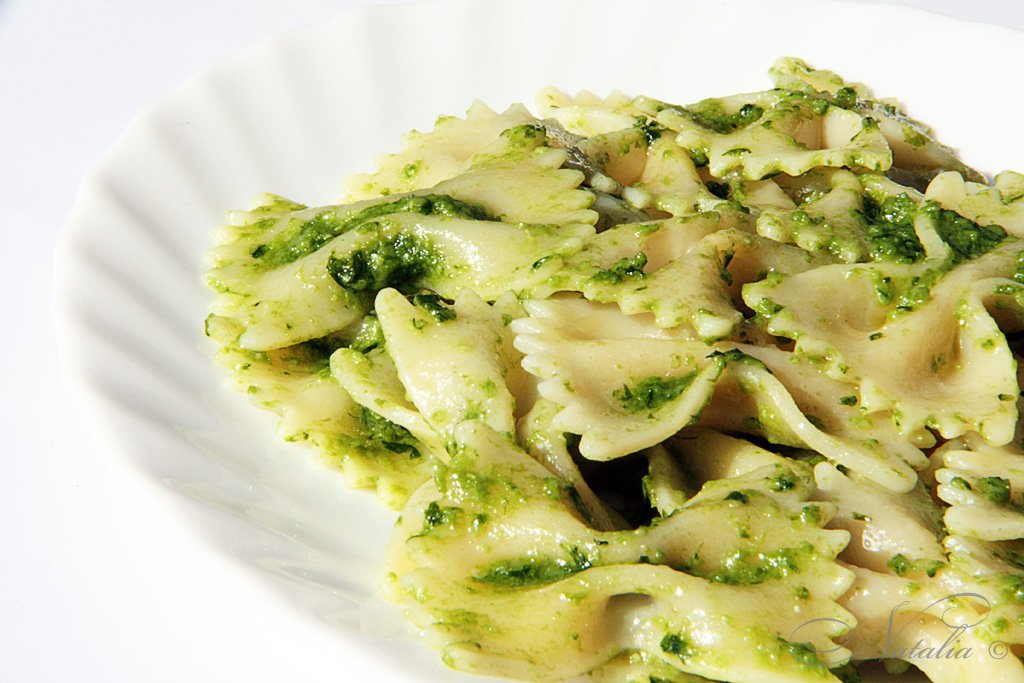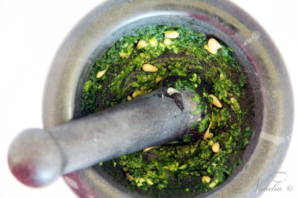 Только я ножом базилик нарезала, а это не особо правильно. Надо рвать руками или керамическим ножом нарезать. Но нож такой стоит огого, а руками долго. У нас уже бантики варились, а я все с соусом капалась :) Еще бы ты не любила чеснок и кедровые орешки ! У вас же квартира в Лигурии. Так что вы автоматом в западной группировке.