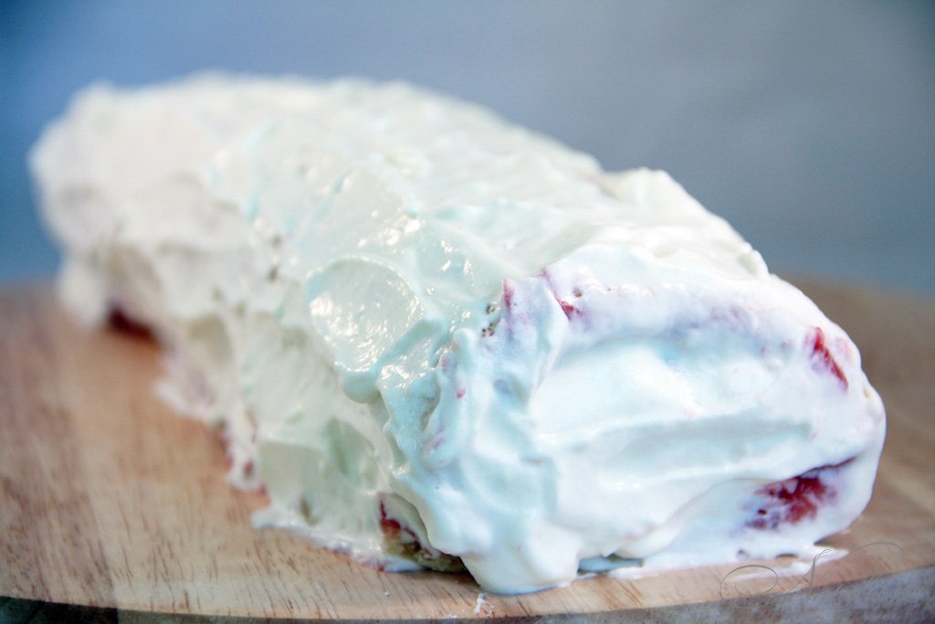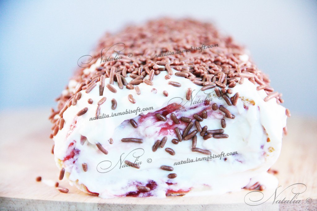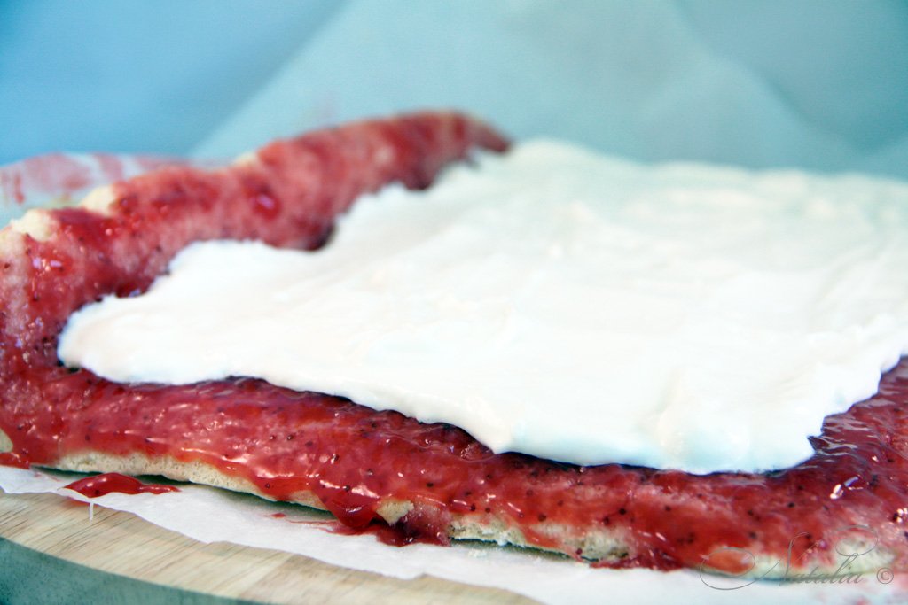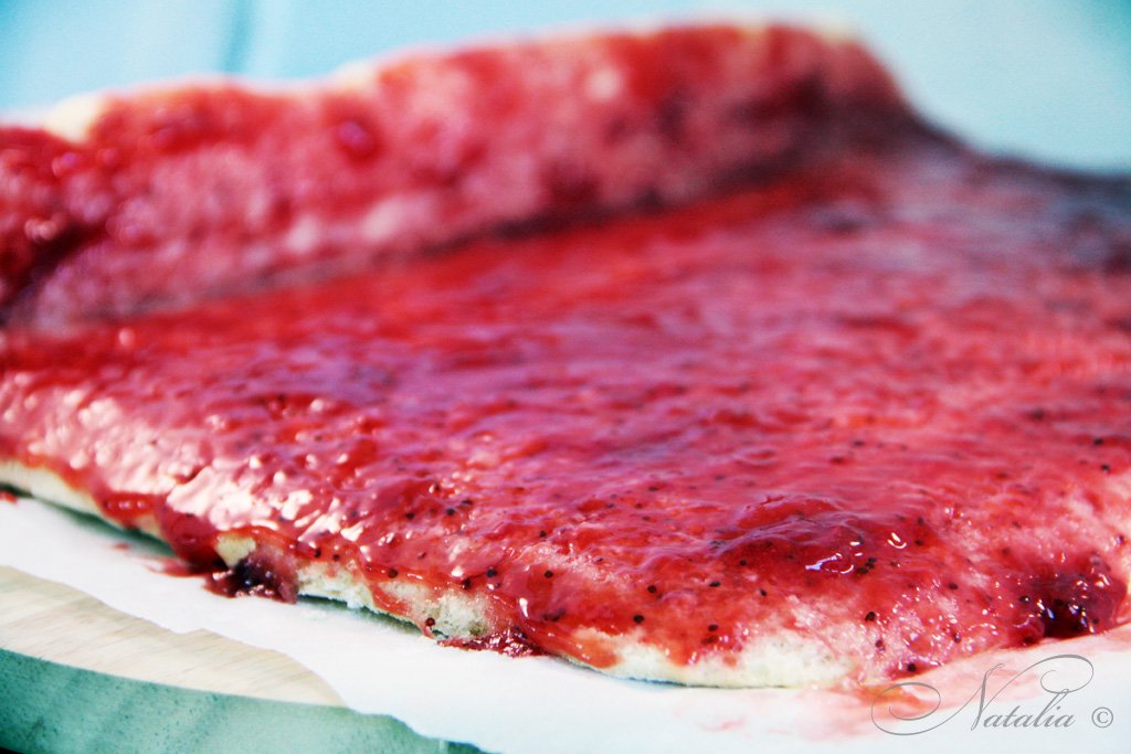 | Когда корж полностью остынет мы его разворачиваем и смазываем вареньем или джемом. | |
