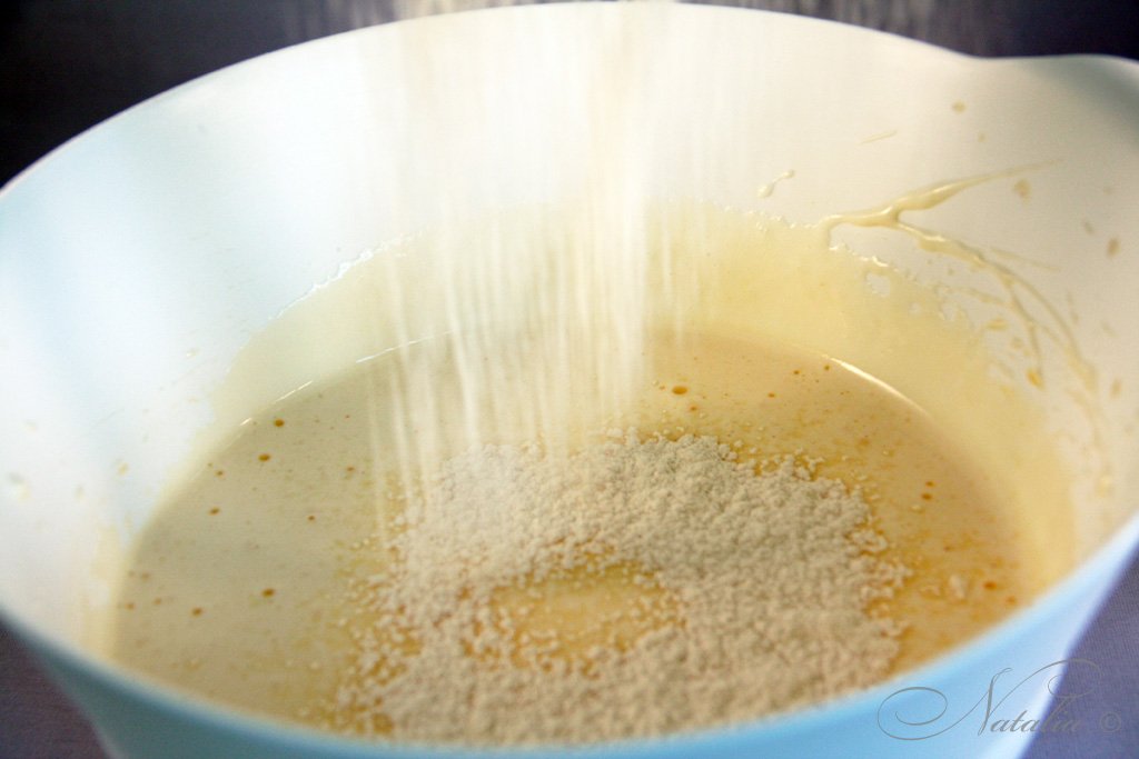 | Муку просеиваем с разрыхлителем в яичную смесь и перемешиваем ложкой. Добавляем ванильную эссенцию или ванилин на кончике ножа. | |