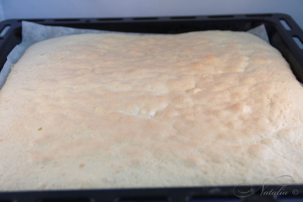 | Полученное тесто выливаем на застеленный пекарской бумагой противень и разравниваем. У меня противень 30см на 27см. Но корж получился на мой взгляд толстоват. Так что можно использовать противень побольше. | |