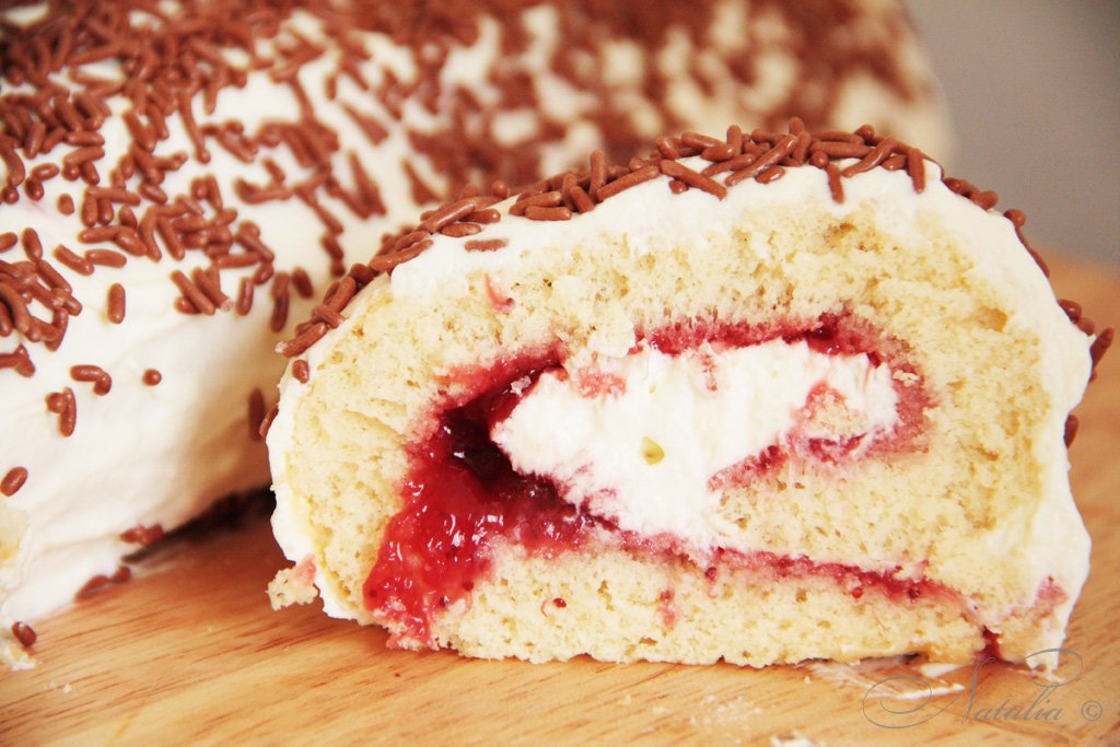 Это очень очень вкусный и нежный рулет. Если вы не пекли ни разу рулеты, то не страшно. Это мой первый рулет и я очень боялась, что он потрескается или я не смогу завернуть. Оказалось рулет печь очень просто. Возможно мне просто повезло с рецептом, но значит и вам повезло с ним :) Попробуйте испечь!