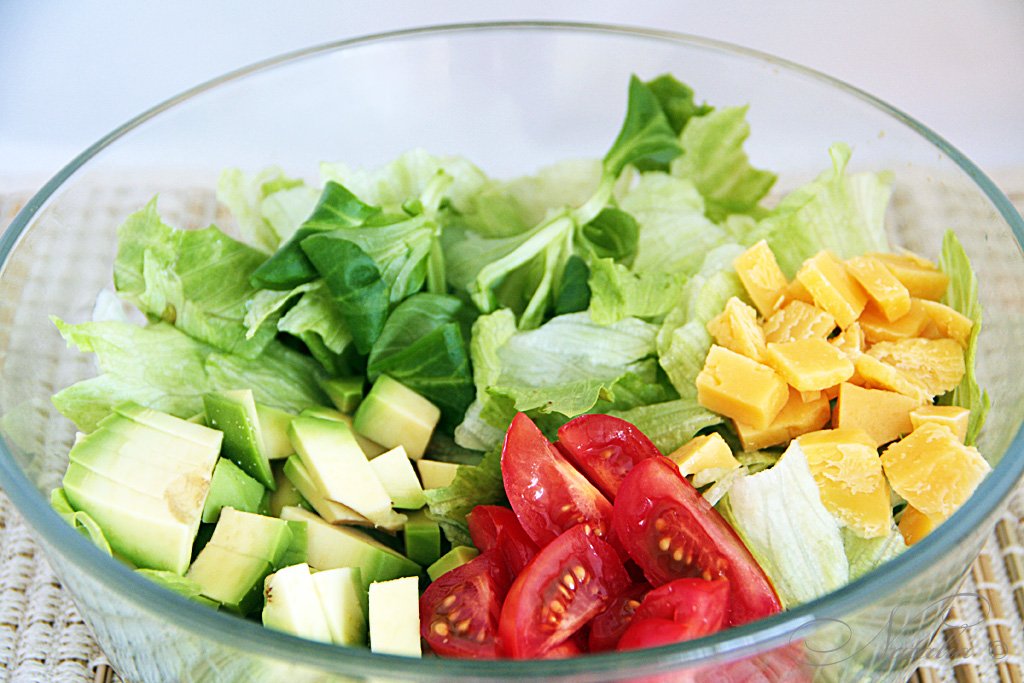 | Моем и обсушиваем листья салата. Очищаем от кожи и нарезаем на кубики авокадо. Нарезаем помидор и сыр. | |