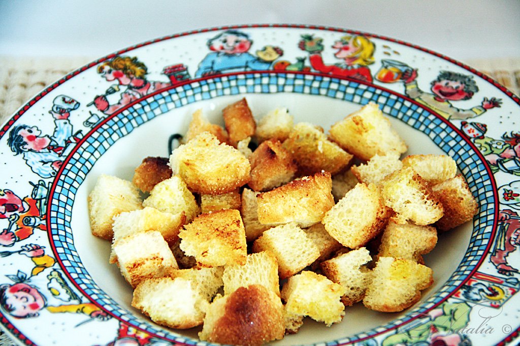 | Хлеб для гренок нарезаем кубиками и обжариваем на растительном масле до золотистого цвета. Можно натереть зубчиком чеснока сковороду, а потом масло добавить и жарить крутоны-гренки-сухарики. | |