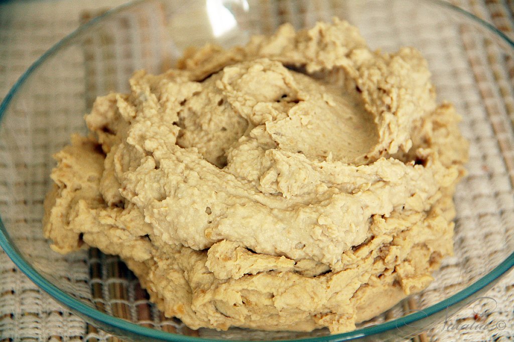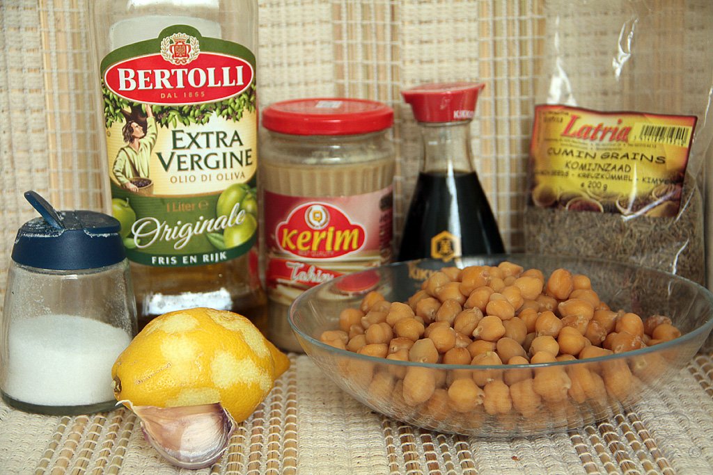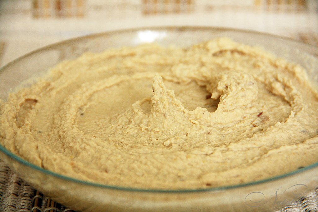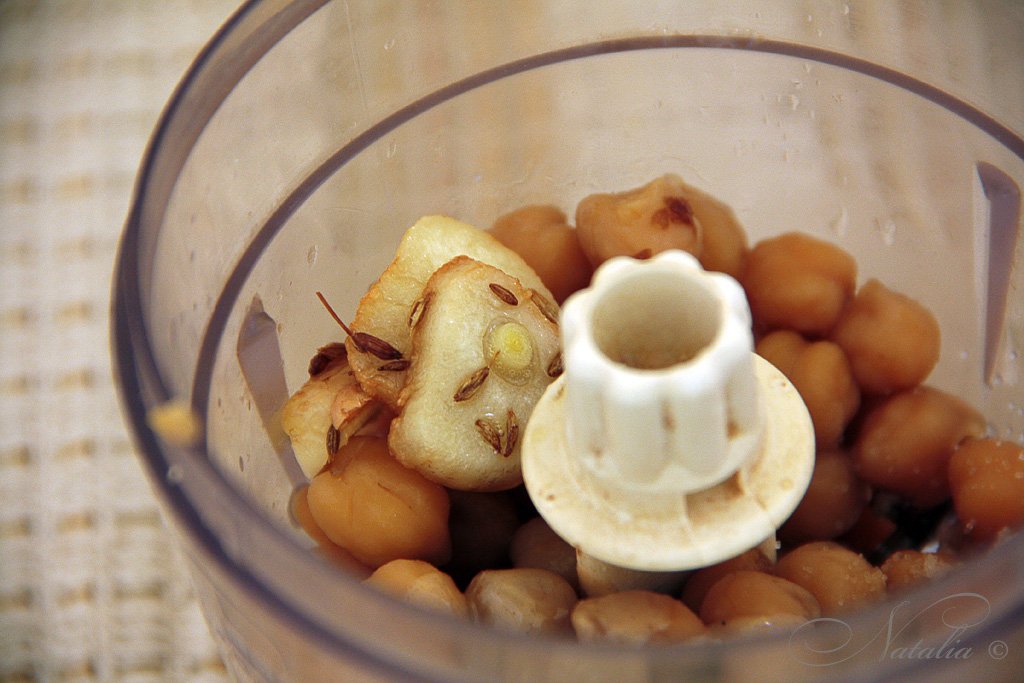 | Нут замачиваем на ночь, утром меняем воду и ставим вариться на 1 час со щепоткой соды. Потом процеживаем горох. Кладем в комбайн горох, чеснок, тахини, сок лимона, соль, соевый соус, масло с кумином и измельчаем. Я делала частями в небольшом блендере. | |