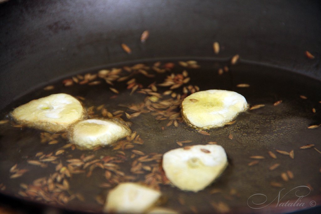 | На сковороде нагреваем масло около 1 минуты. Добавляем порезанный чеснок и кумин. Когда вокруг долек чеснока появятся пузырьки, но он еще не изменит цвет, выключаем огонь. | |