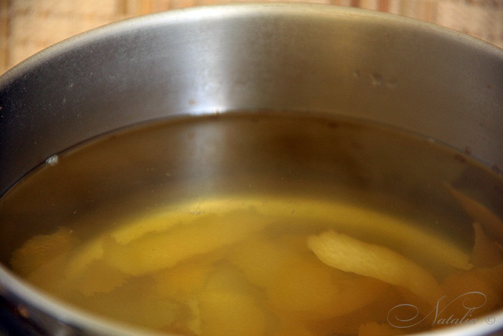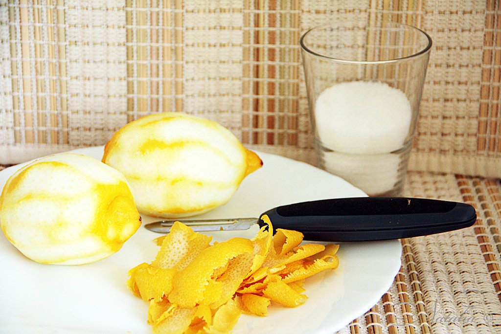 | Снимаем овощечисткой цедру с двух лимонов. Выжимаем из них сок. | |
