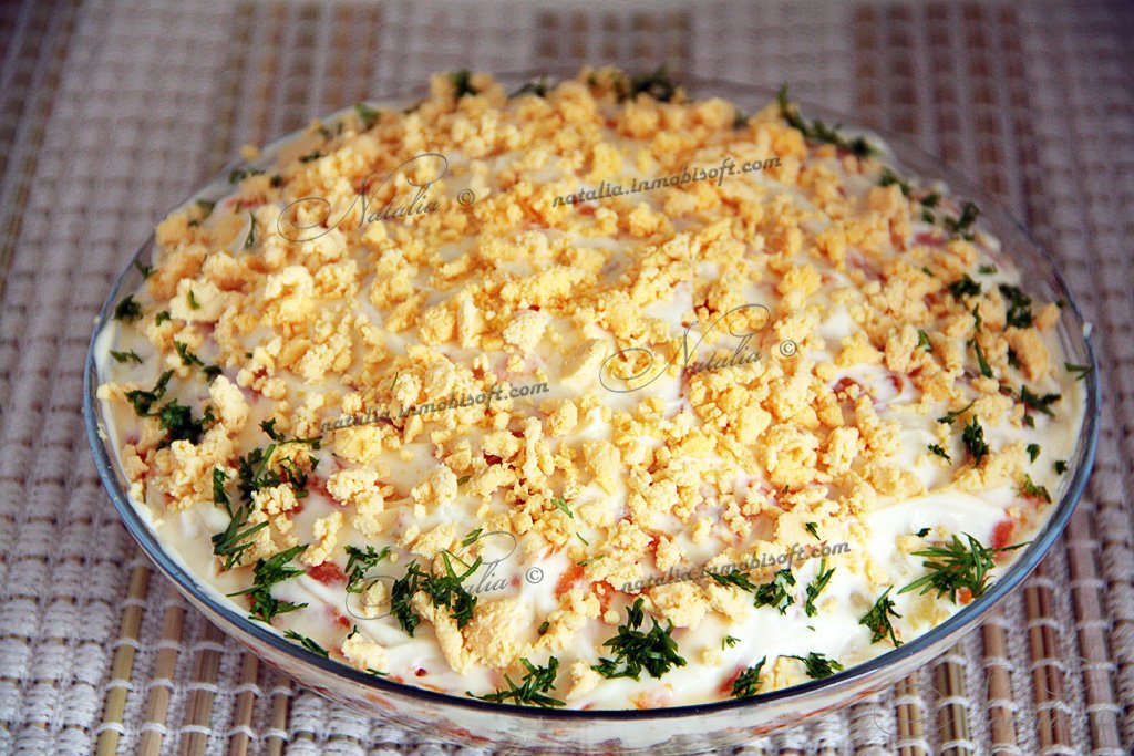 | Сглаживаем ложкой майонез и украшаем измельченным куриным желтком и зеленью. Отправляем в холодильник на пару часов, а лучше на ночь. Приятного аппетита! |