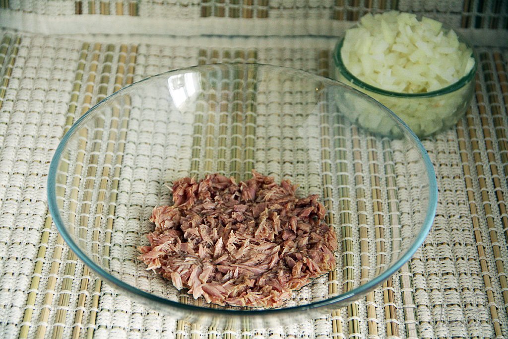 | Вскрываем консерву и прям в банке вилочкой измельчаем ее. 1/3 рыбы выкладываем в салатник, а затем посыпаем частью лука. | |