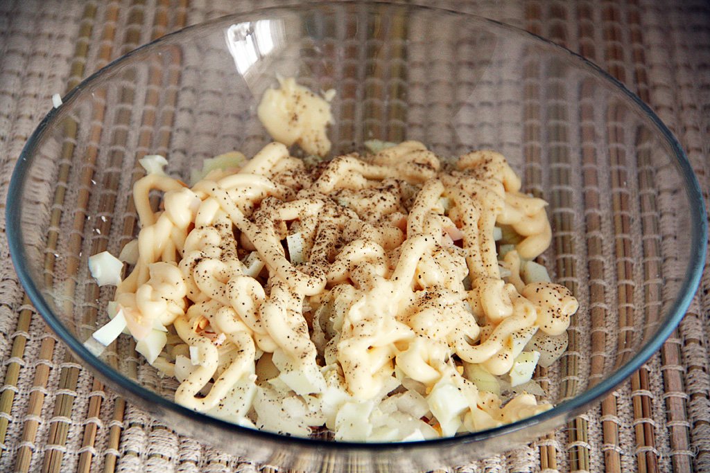 | Поверх лука нарезаем яичный белок. Затем майонез и перчик черный. | |