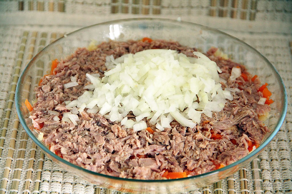 2-й слой: Мелко нарезанный репчатый лук. Его надо предварительно подержать 5 минут в кипятке, чтобы сошла горечь и не хрустел на зубах. Благодаря этому его также «не унюхают» в салате те, кто категорически отказываются есть лук.