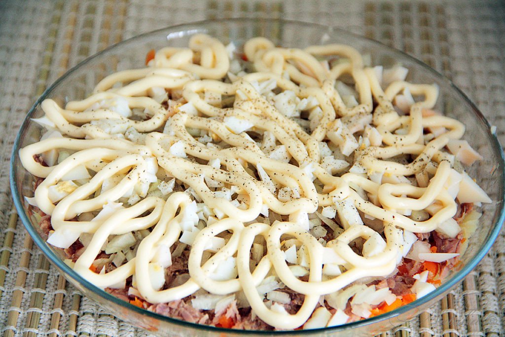 8-й слой: Тонкий слой майонеза — но можно и пропустить.