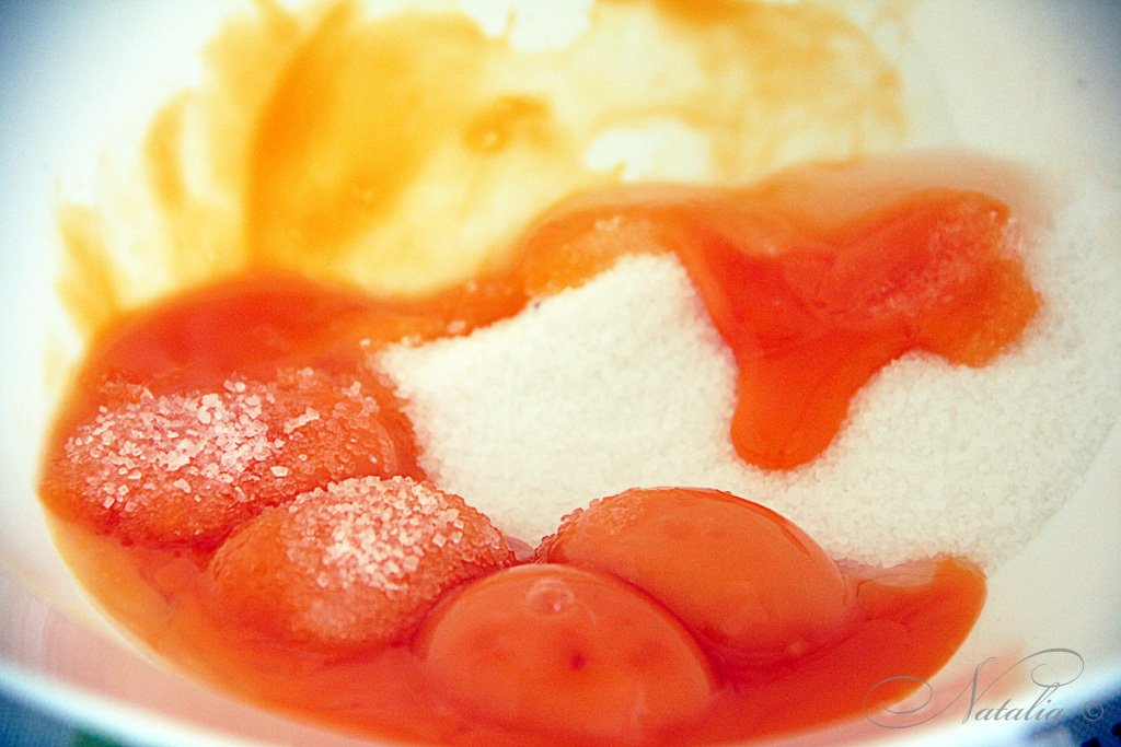 Делим яйца на желтки и белки. Желтки взбиваем со 100 гр. сахара.