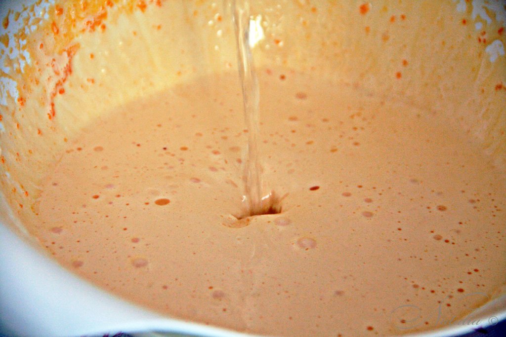Во взбитые желтки с сахаром вливаем воду и растительное масло. Хорошенько взбиваем все.