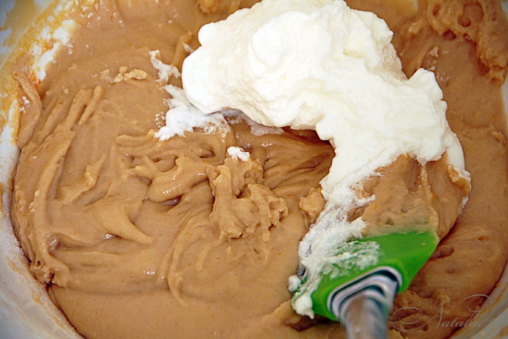 Муку просеиваем с разрыхлителем в яично-масляную эмульсию. Перемешиваем до однородности. Небольшими частями добавляем белки и перемешиваем. Можно миксером на маленькой скорости или ложкой (как я) движениями снизу вверх.