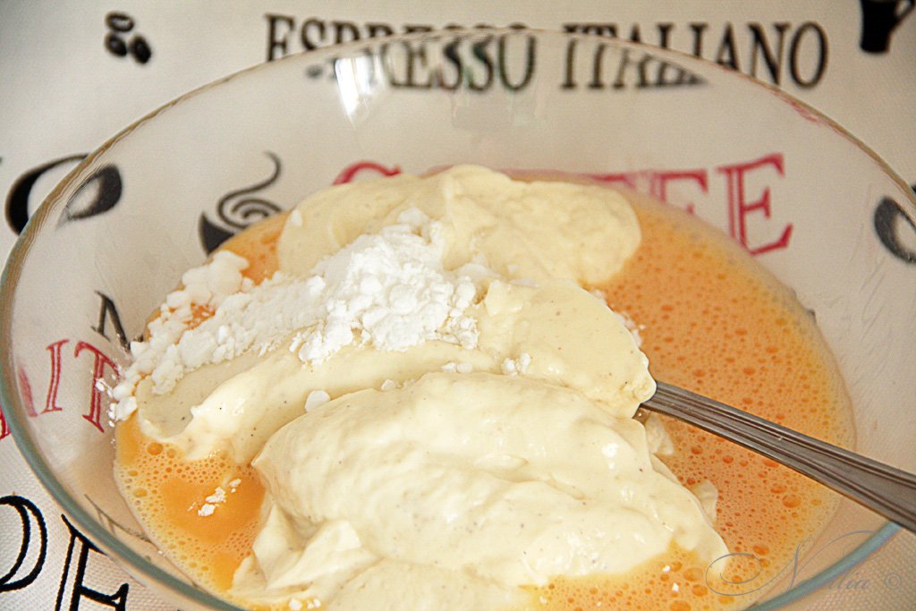 Для творожного крема перемешиваем творог с сахарн.пудрой и яйцом. Добавляем крахмал, ваниль и цедру.