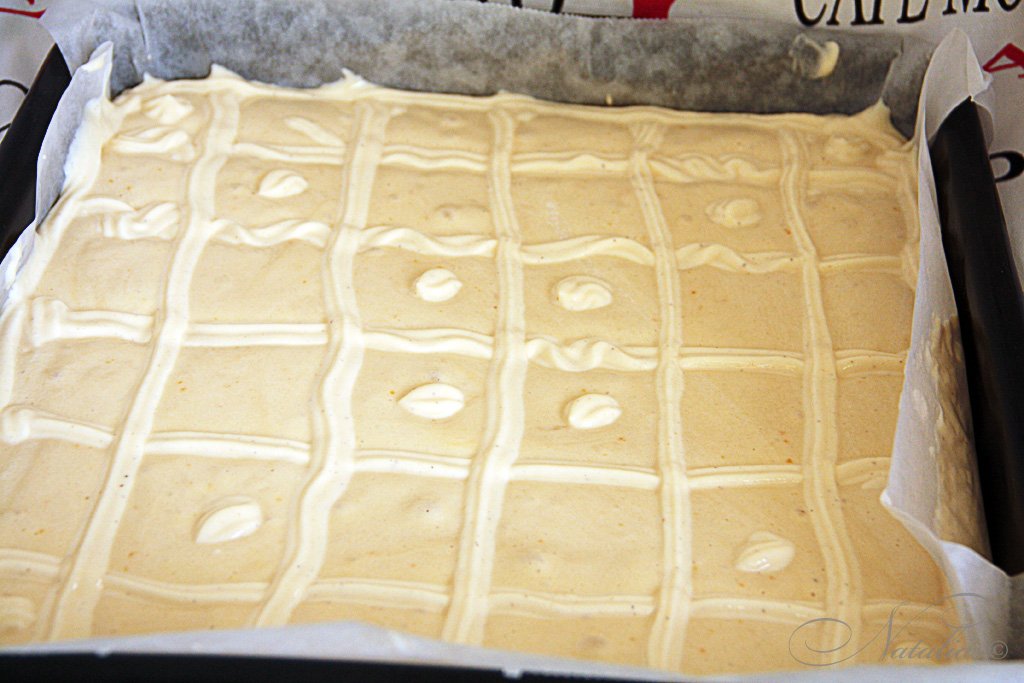 Глубокий противень выстилаем пергаментом и выливаем тесто. Творожный крем отсаживаем с помощью корнетика в виде решетки. Или переложите в чистый пакетик и отрежьте угол.