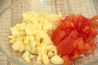 | Удаленную мякоть кабачка мелко нарезаем. С помидора снимаем кожу и удаляем семена с жидкостью. Кожу с помидора можно снять так: сделать надрез в виде креста и обдать кипятком помидор. | |