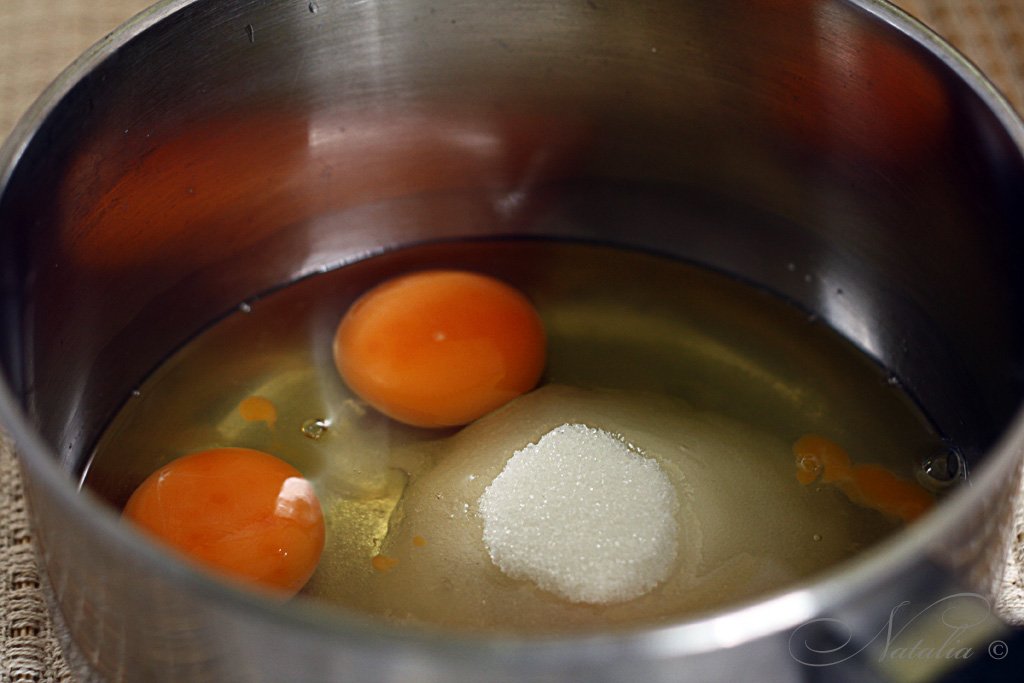 | В другой кастрюльке (большего объема) взбиваем яйца с сахаром. | |
