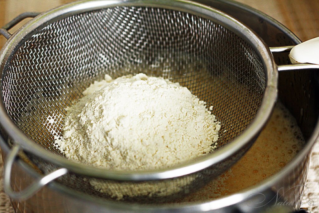 | Затем в яйца просеиваем муку. И взбиваем до исчезновения комков. | |