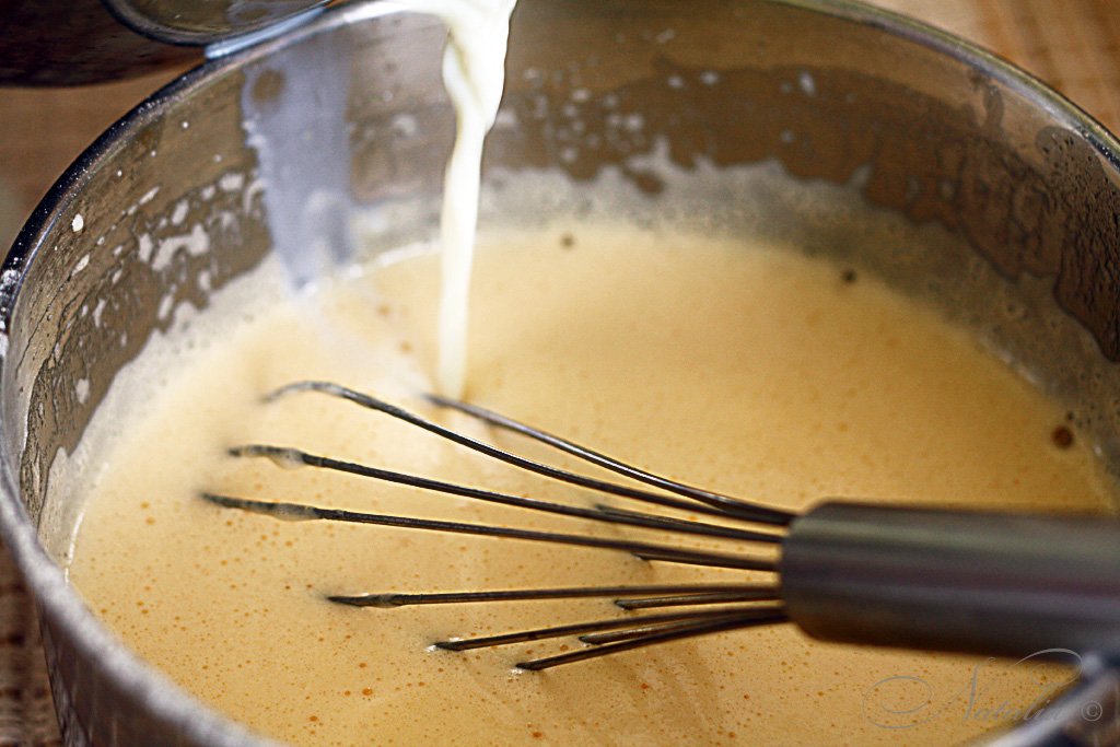 | К яйцам тонкой струйкой вводим горячее молоко и хорошо перемешиваем. Ставим смесь на плиту и непрерывно помешивая, доводим до загустения, но не кипятим. Лучше мешать деревянной лопаткой. | |