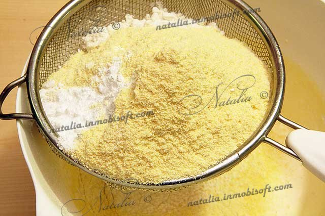 | Просеиваем в яйцо муку (оба вида), разрыхлитель. Перемешиваем все. | |