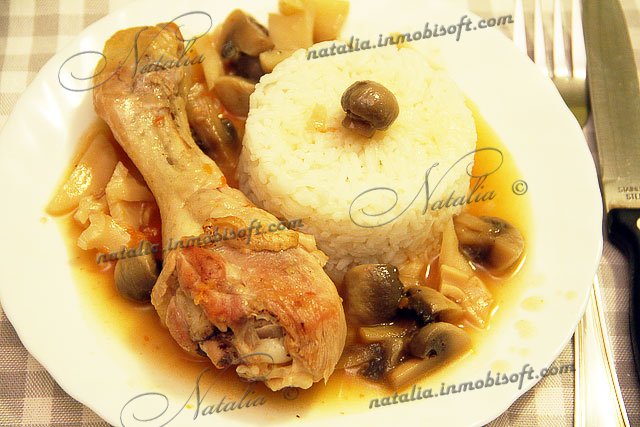 | Грибы чистим, моем и нарезаем. Если есть возможность возьмите мелкие шампиньоны так красивее. Бамбук промываем водой и нарезаем полосками. Помидор очищаем от кожи и тоже нарезаем. Все кладем в кастрюлю к курице. Добавляем соевый соус. Заливаем горячей водой и тушим под крышкой 30 минут. | |