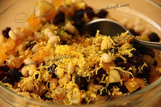 | Первым делом моем и ошпариваем изюм. Смешиваем с цукатами, орехами, цедрой и ромом (у меня ароматизатор). | |