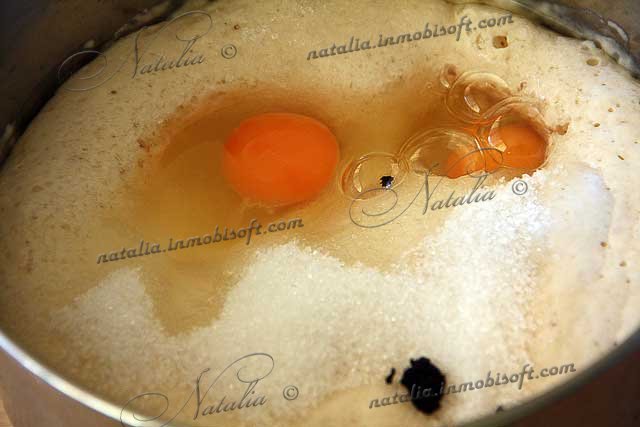 | Добавляем к опаре яйца, сахар и ваниль. Перемешиваем. | |