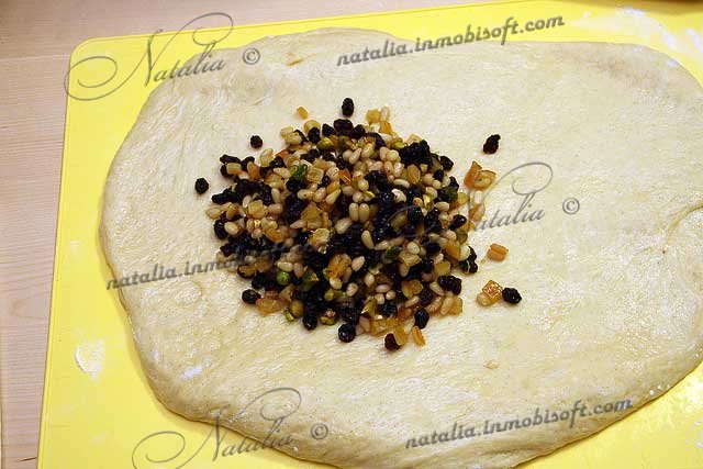 | Тесто приминаем и слегка раскатываем. Выкладываем на него цукаты и вымешиваем 2-3 минуты. | |