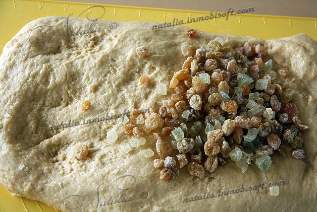 | Вытягиваем тесто в прямоугольник и добавляем часть изюма с цукатами (смешанными с мукой). Изюм я замачивала в роме. Месим тесто руками добавляя изюм+цукаты до конца. | |