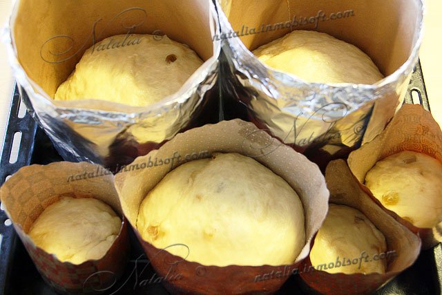 | Делим тесто на количество форм. Дома нашлись прошлогодние, а две большие скрутили из фольги и пергамента. Тесто должно занимать 1/3 — 2/3 формы примерно. Накрываем полотенцем и даем подойти 30 минут. | |