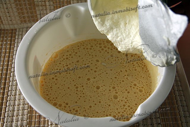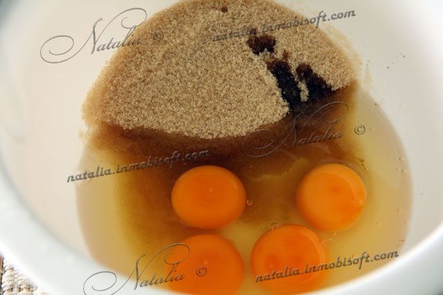 | Яйца взбиваем с сахаром и ванилью в пышную белую массу (миксером это займет 2-3 мин). | |
