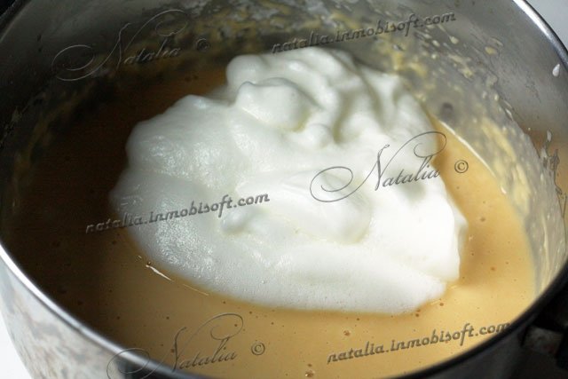 | Белки хорошо взбить с щепоткой соли. Аккуратно перемешать ложкой с остальным тестом. Перемешиваем от края к центру движениями снизу вверх. | |