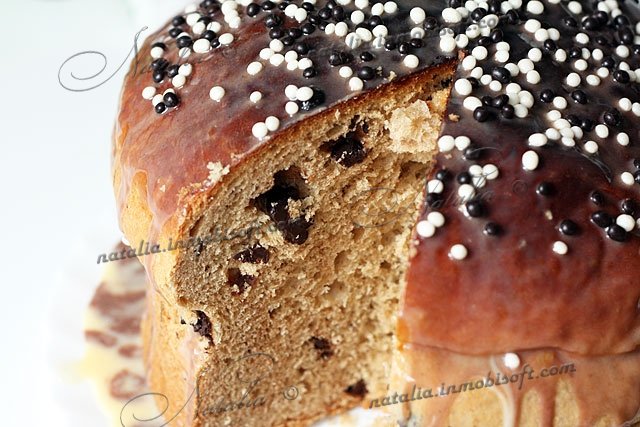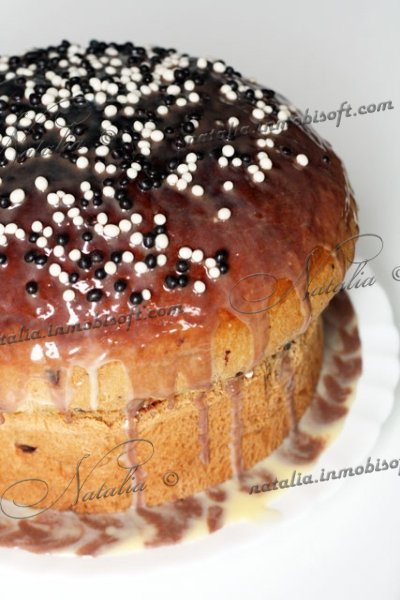 Остывший кулич поливаем шоколадом или глазурью. Я полила сначала белым ганашем, а потом добавила в остаток какао и полила сверху еще раз.