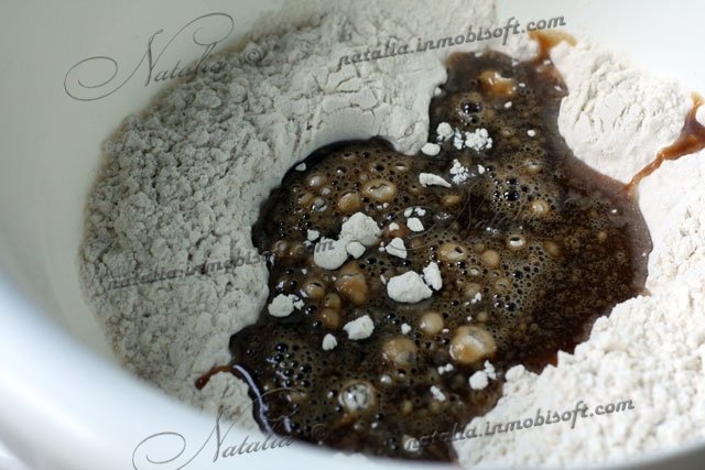 Выливаем жидкие ингредиенты в муку и начинаем мешать (миксером удобнее).