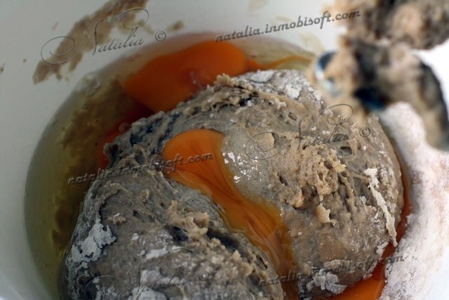 Добавляем 2 яйца и 1 желток. Белок оставшийся не выбрасываем.