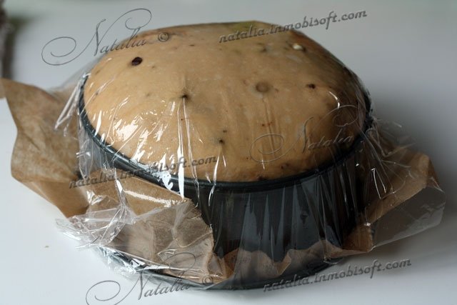 Выпекаем при 190 градусах 35 минут. Затем накрываем фольгой и печем при 180 градусах еще 10-15 минут. Готовность проверяем лучинкой. Вынимаем из формы и даем остыть на боку. Периодически катая его иначе будет плоский с одной стороны.