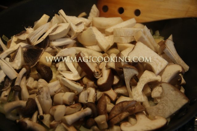 | Грибы моем, чистим и нарезаем. Отправляем к луку и накрываем крышкой. Добавляем соль. Тушим 10 минут. | |