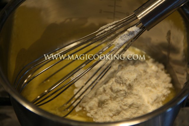 | В это время в ковшике с толстым дном топим 30 гр сливочного масла. Добавляем муку и перемешиваем. | |