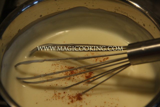 | Тонкой струйкой вливаем молоко и при этом помешиваем. Нужно добиться однородности. Помешиваем пока соус не загустеет. В готовый соус добавляем щепотку мускатного ореха и перемешиваем. | |
