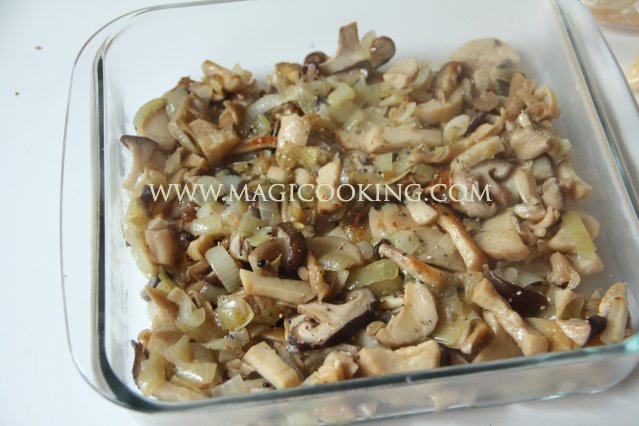 | Раскладываем грибы по формочкам или в одну большую. Добавляем перец. | |